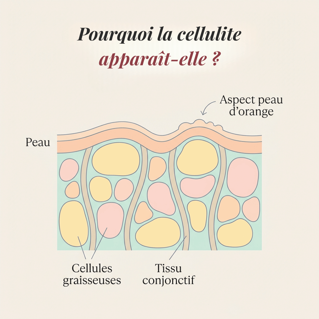 La cellulite apparaît lorsque les cellules graisseuses s’accumulent sous la peau et exercent une pression sur les tissus environnants. Cela crée cet aspect de peau d’orange visible sur les cuisses et les fesses.